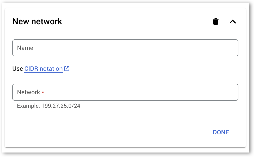 - Click on Add a network under the Authorized networks section. New network section will open.