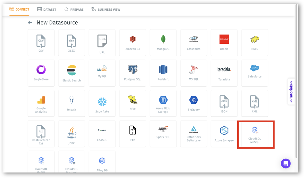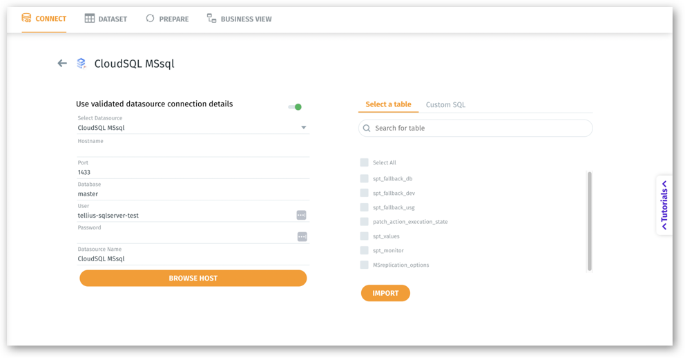 - In the Tellius platform, navigate to Data → Connect → Create New → MSSQL.