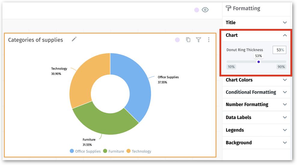 - In Vizpads, users can configure the thickness of the ring found in donut charts.