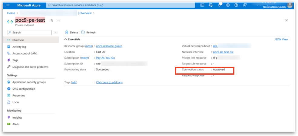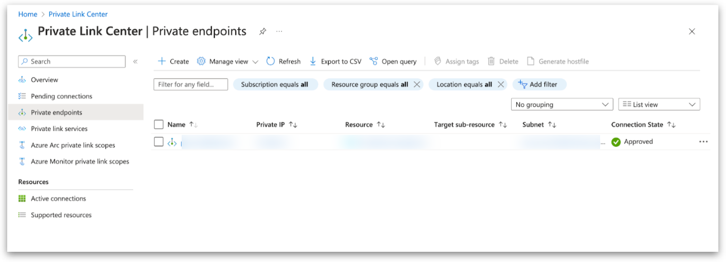 <private-endpoint-id>with the value obtained in step 2 - Now, the Private Endpoint is in "Approved" state in the Azure Portal.