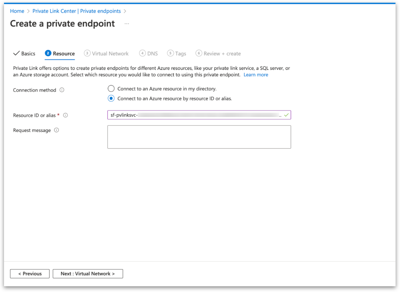 - Since the Private Endpoint is in a “Pending” state, and to move it to the “Approved” state, the following needs to be executed on Azure CLI. Note down the resource ID output from the Azure CLI command: