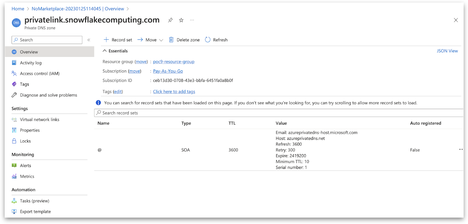 - Name: <privatelink-account-url> (from the saved Snowflake JSON output)