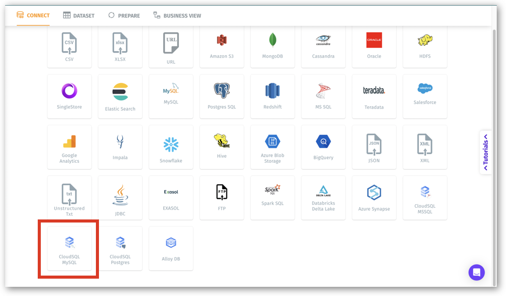 - In the Tellius platform, navigate to Data → Connect → Create New → MySQL.