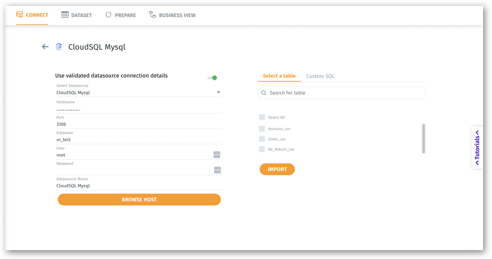 - Click on Save and Browse Host (or Browse Host if you are using an already established connection). The list of tables from the data source will be displayed on the right side.