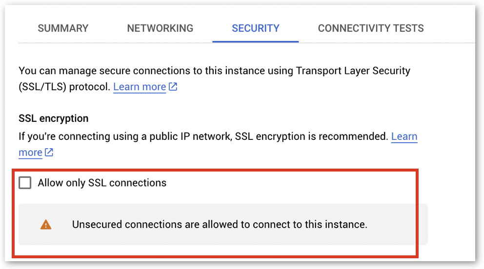 If “Unsecured connections are allowed to connect to this instance” is displayed, you do not need to change anything.