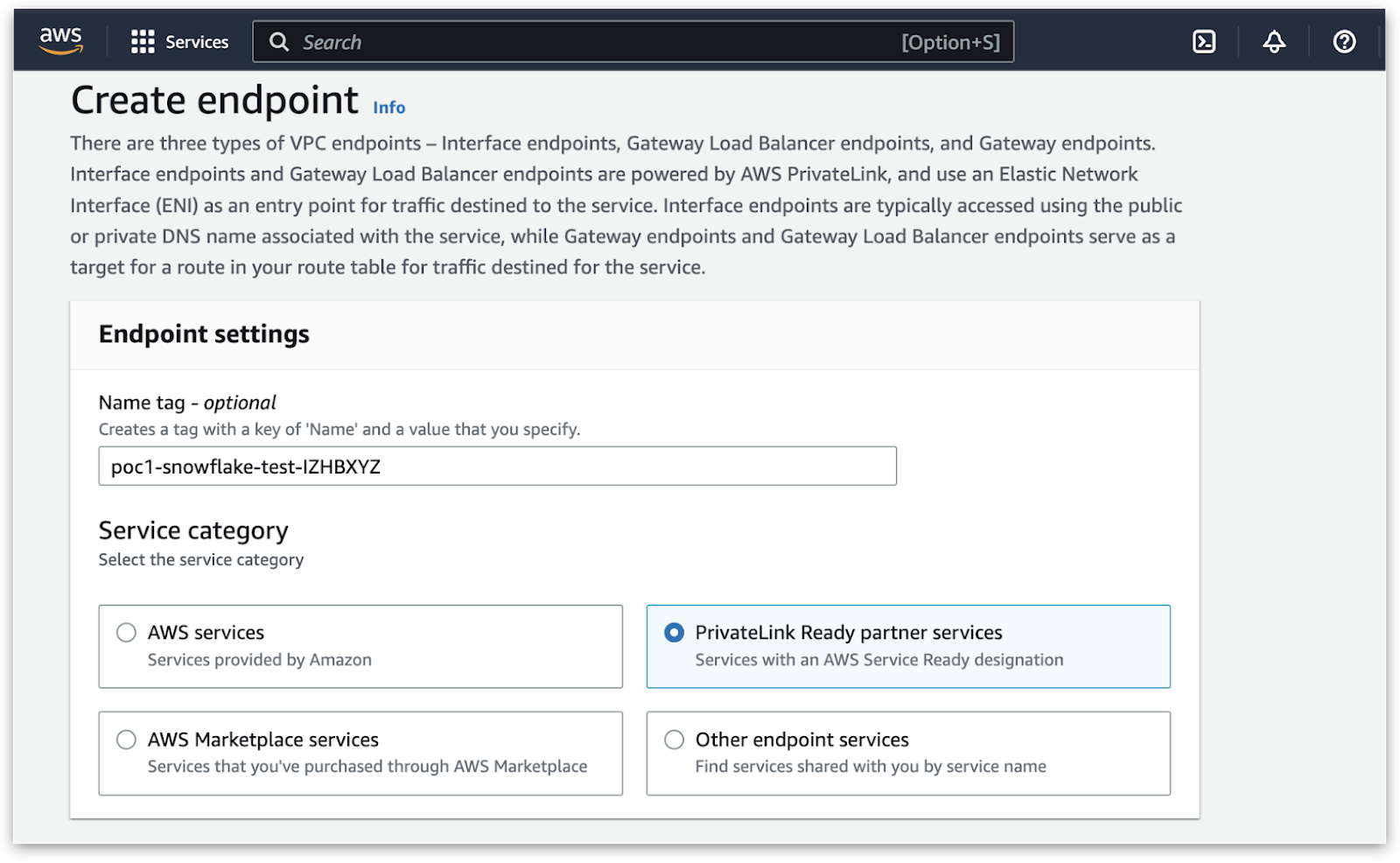 - Create a VPC Endpoint on the AWS console for tunneling PrivateLink endpoints. Enter the resource ID of